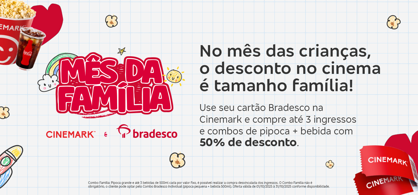 Veja o regulamento completoVocê é quem manda: pode comprar só o ingresso meia cartão Bradesco, só o combo ou o ingresso meia cartão Bradesco + combo meia cartão Bradesco com 50% de desconto direto nas bilheterias Cinemark.