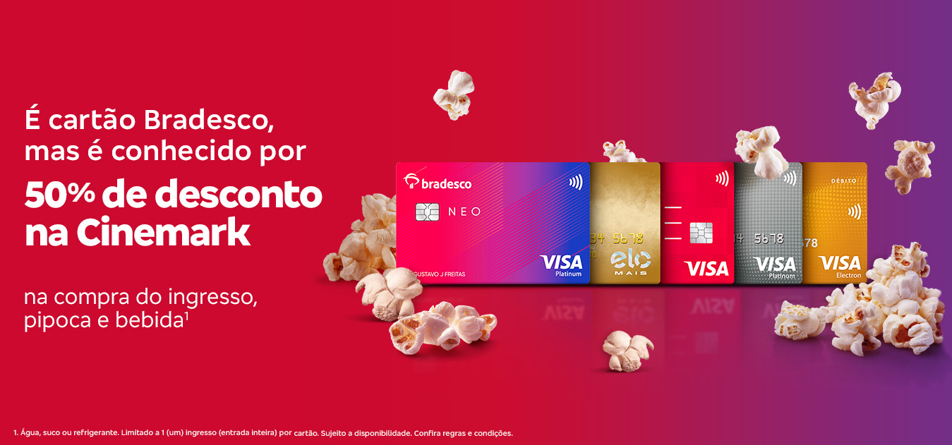 Compre também no App Cinemark ou pelo site cinemark.com.br Basta escolher o filme, o assento e, em seguida, a opção meia cartão Bradesco. Se quiser, você também pode selecionar e comprar o combo meia cartão Bradesco nessa mesma opção.