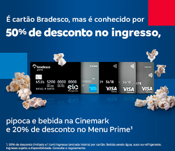 Ingresso meia Cartão Bradesco: Ganhe 50% de desconto no valor do ingresso em toda a rede Cinemark do Brasil.