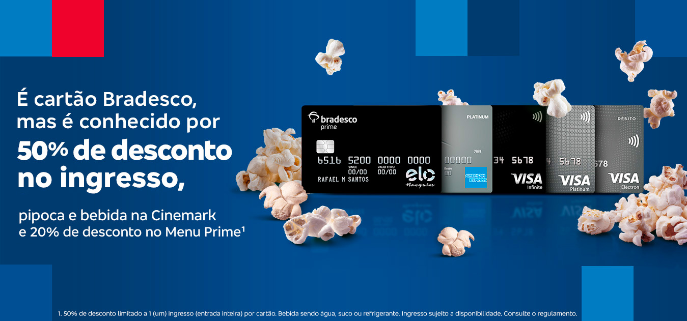 Veja o regulamento completo: Salas Bradesco Prime Salas ConvencionaisVocê é quem manda: pode comprar só o ingresso meia cartão Bradesco, só o combo ou o ingresso meia cartão Bradesco + combo meia cartão Bradesco com 50% de desconto direto nas bilheterias Cinemark.